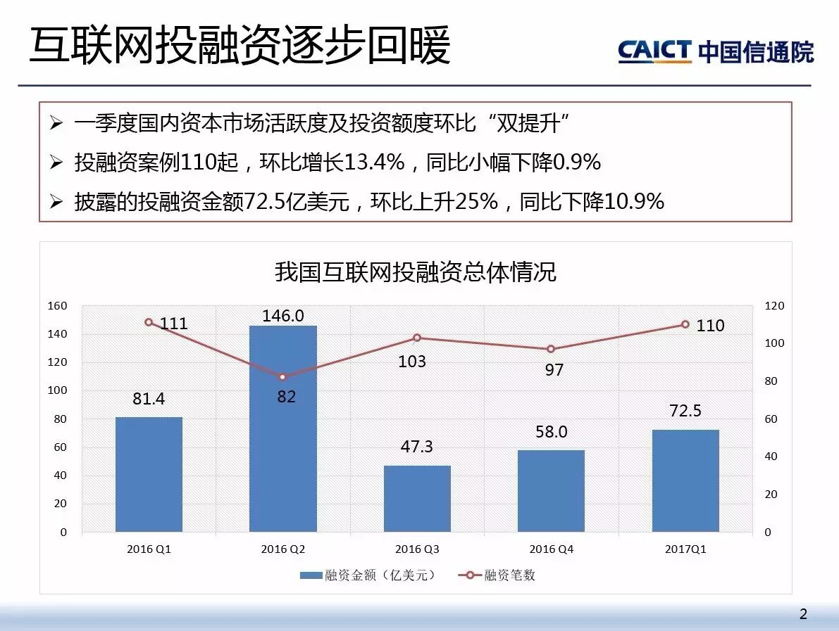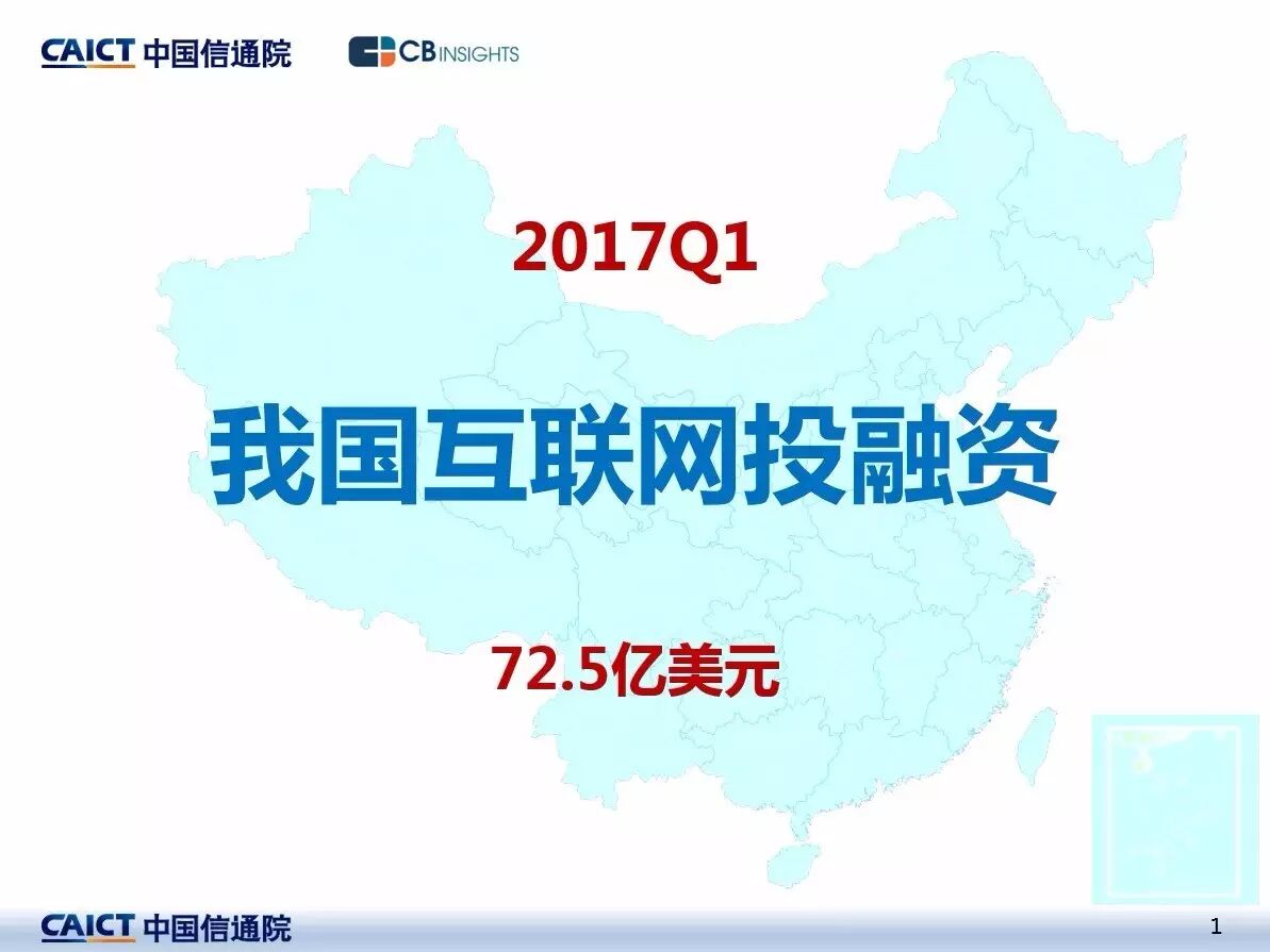 2017年一季度,我国互联网投融资总额72.5亿美元。