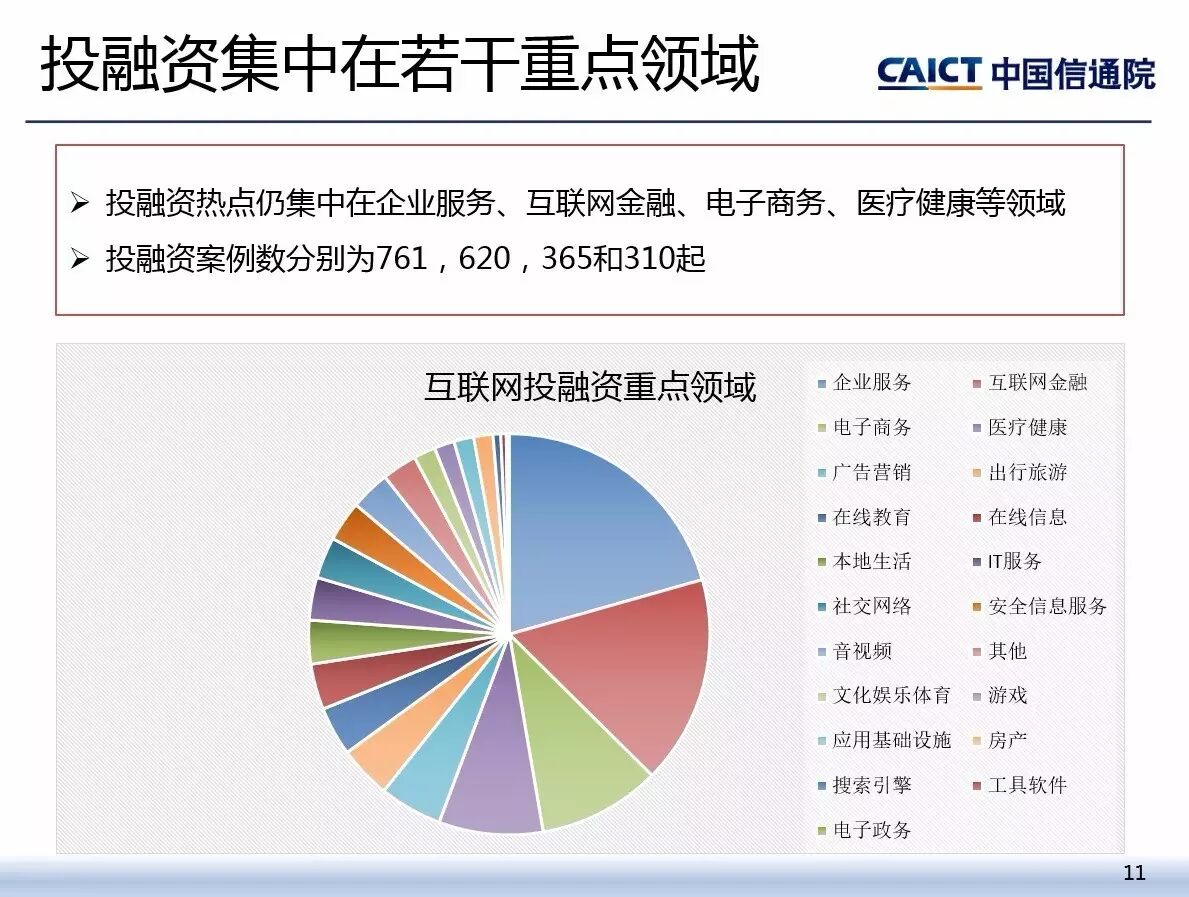 2017年一季度,我国互联网投融资集中在若干重点领域。投融资热点仍集中在电子商务、出行旅游、互联网金融、企业服务等领域 ,投融资案例数分别为20,16,15和11起。