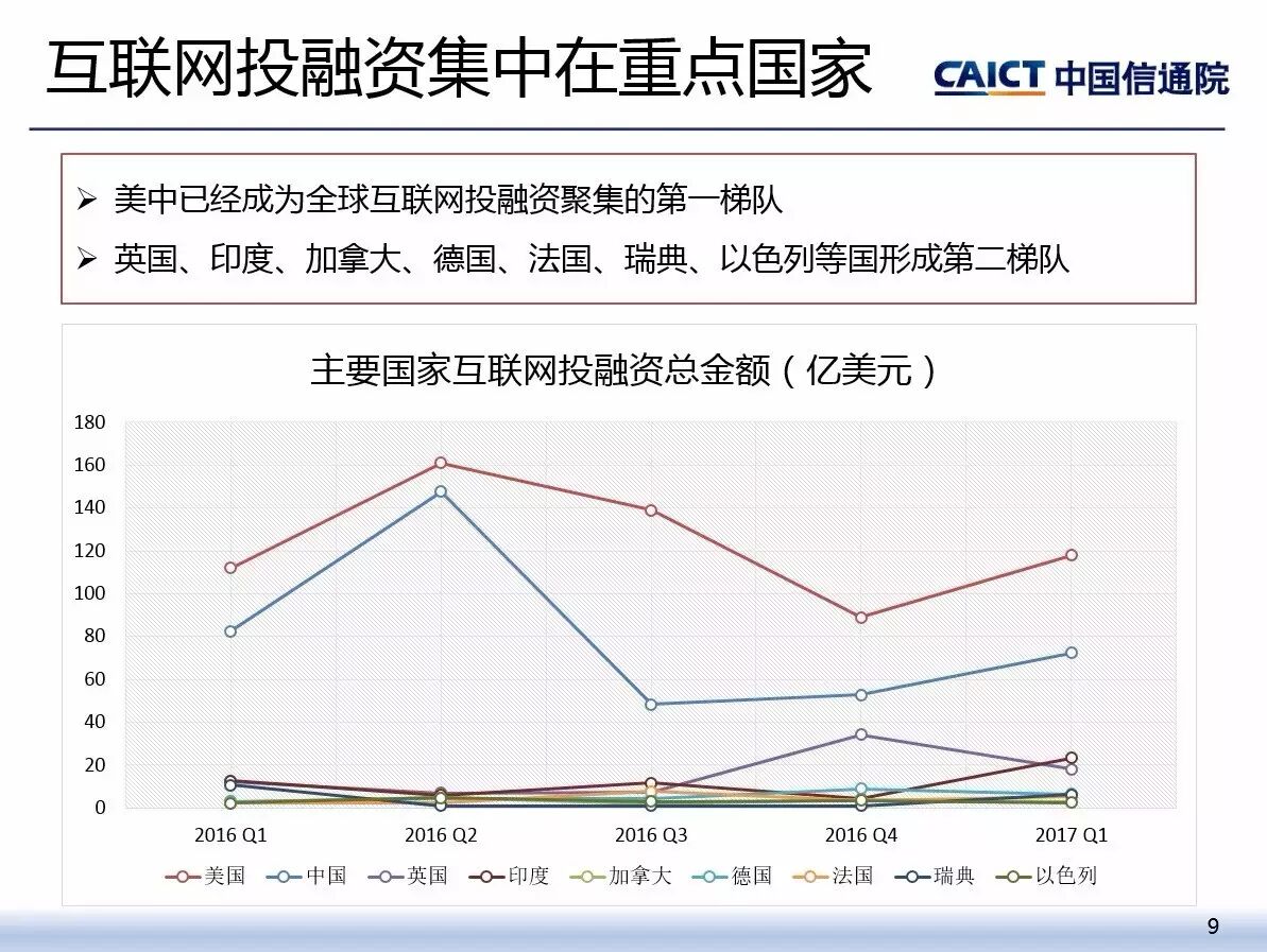 2017年一季度,全球互联网投融资集中在重点国家。美中已经成为全球互联网投融资聚集的第一梯队,英国、印度、加拿大、德国、法国、瑞典、以色列等国形成第二梯队。