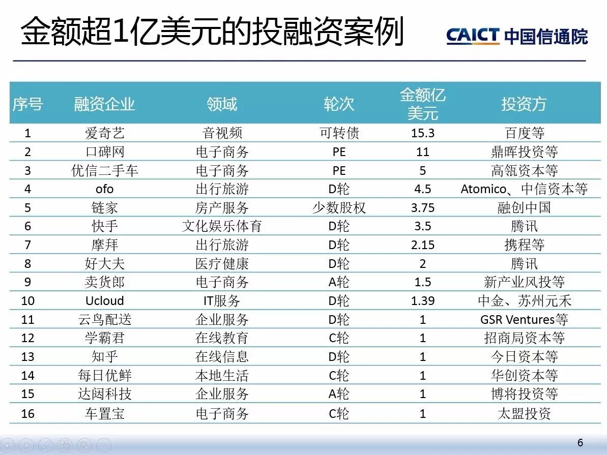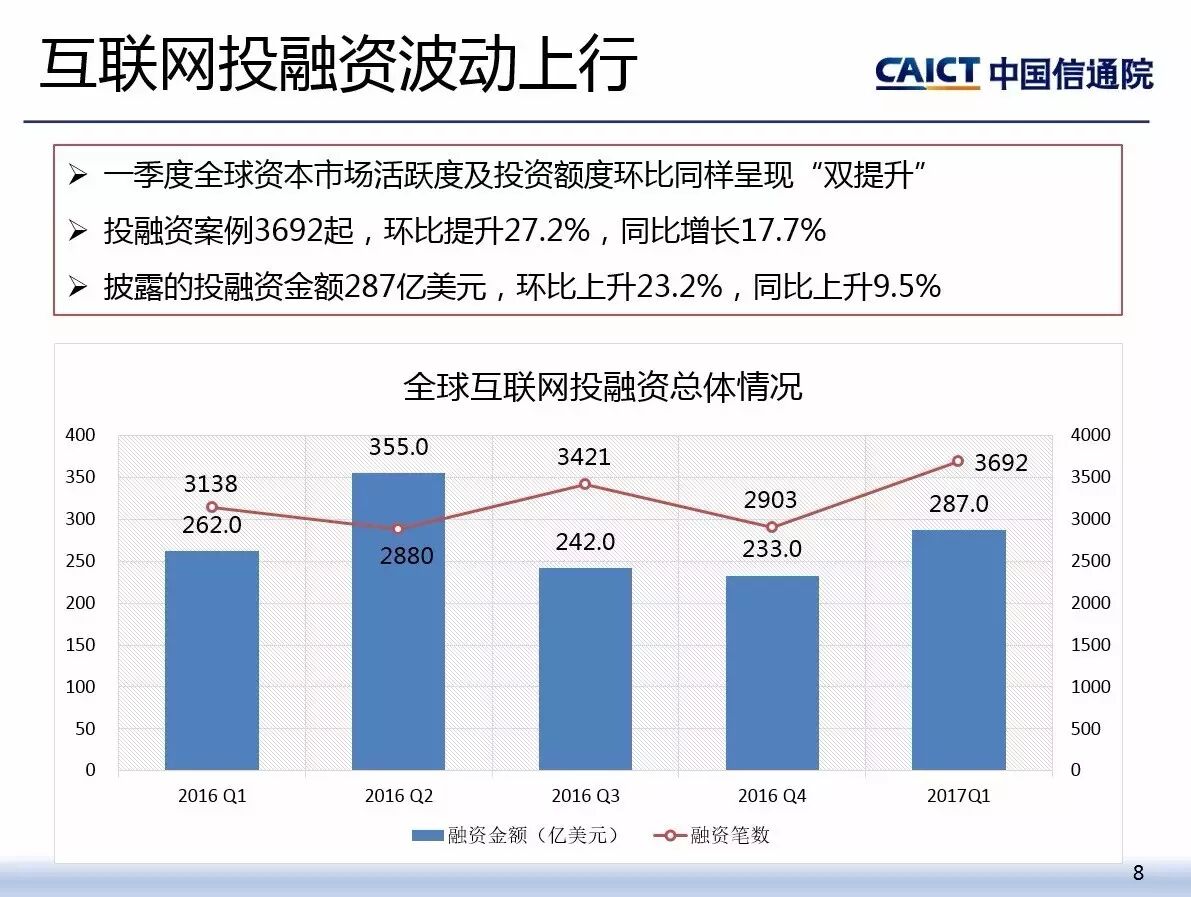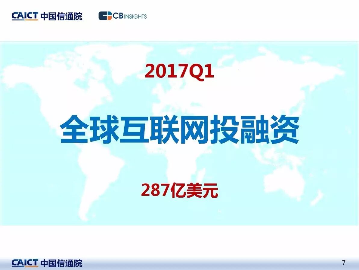 中国信息通信研究院政策与经济研究所互联网运行分析团队发布了《2017年一季度互联网投融资运行情况》报告。报告构建了互联网行业投融资研究框架,借助CB Insights的数据库,深入挖掘我国和全球行业投融资整体态势及重点领域情况,为行业趋势预测、热点问题预判提供重要参考。