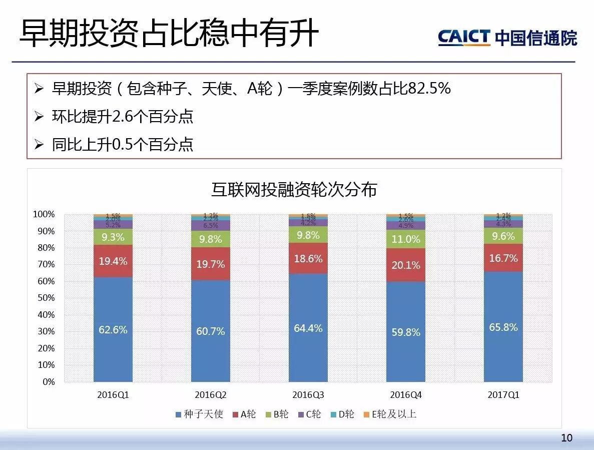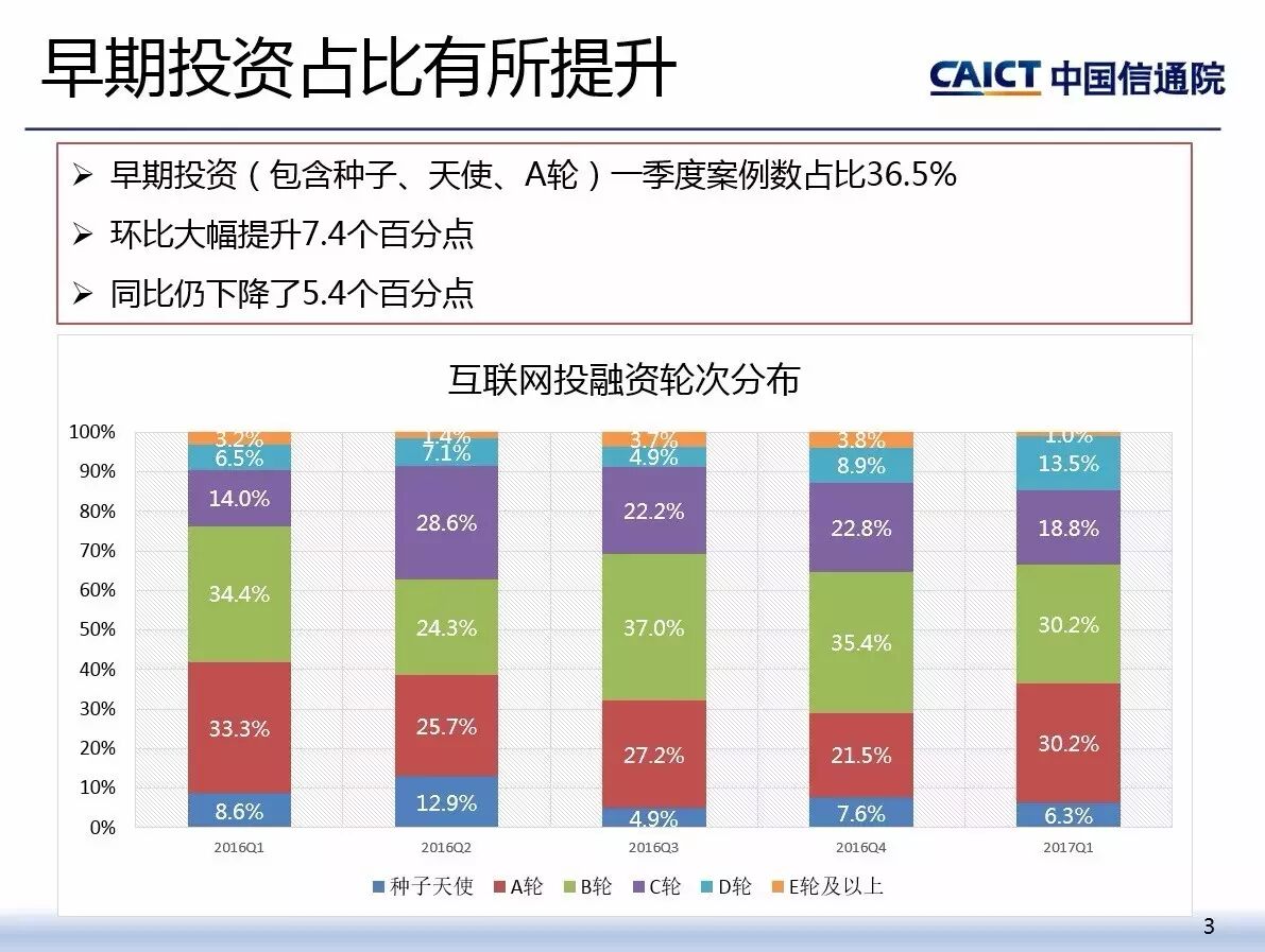 2017年一季度,我国互联网投融资早期投资占比有所提升。早期投资(包含种子、天使、A轮)一季度案例数占比36.5%,环比大幅提升7.4个百分点, 同比仍下降了5.4个百分点。